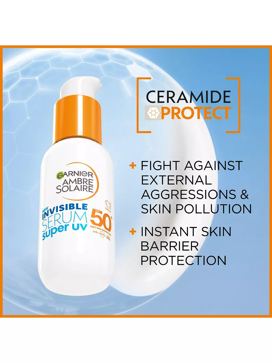 Garnier Ambre Solaire Invisible Super UV SPF 50+ este un ser inovator care oferă o protecție solară extrem de ridicată împotriva razelor UVA și UVB, protejând pielea de efectele nocive ale soarelui. Formula sa ușoară se absoarbe rapid în piele, lăsând-o hidratată și fortificată. Este îmbogățit cu ceramide, care ajută la întărirea barierei pielii, și suc de aloe, cunoscut pentru proprietățile sale calmante și hidratante.